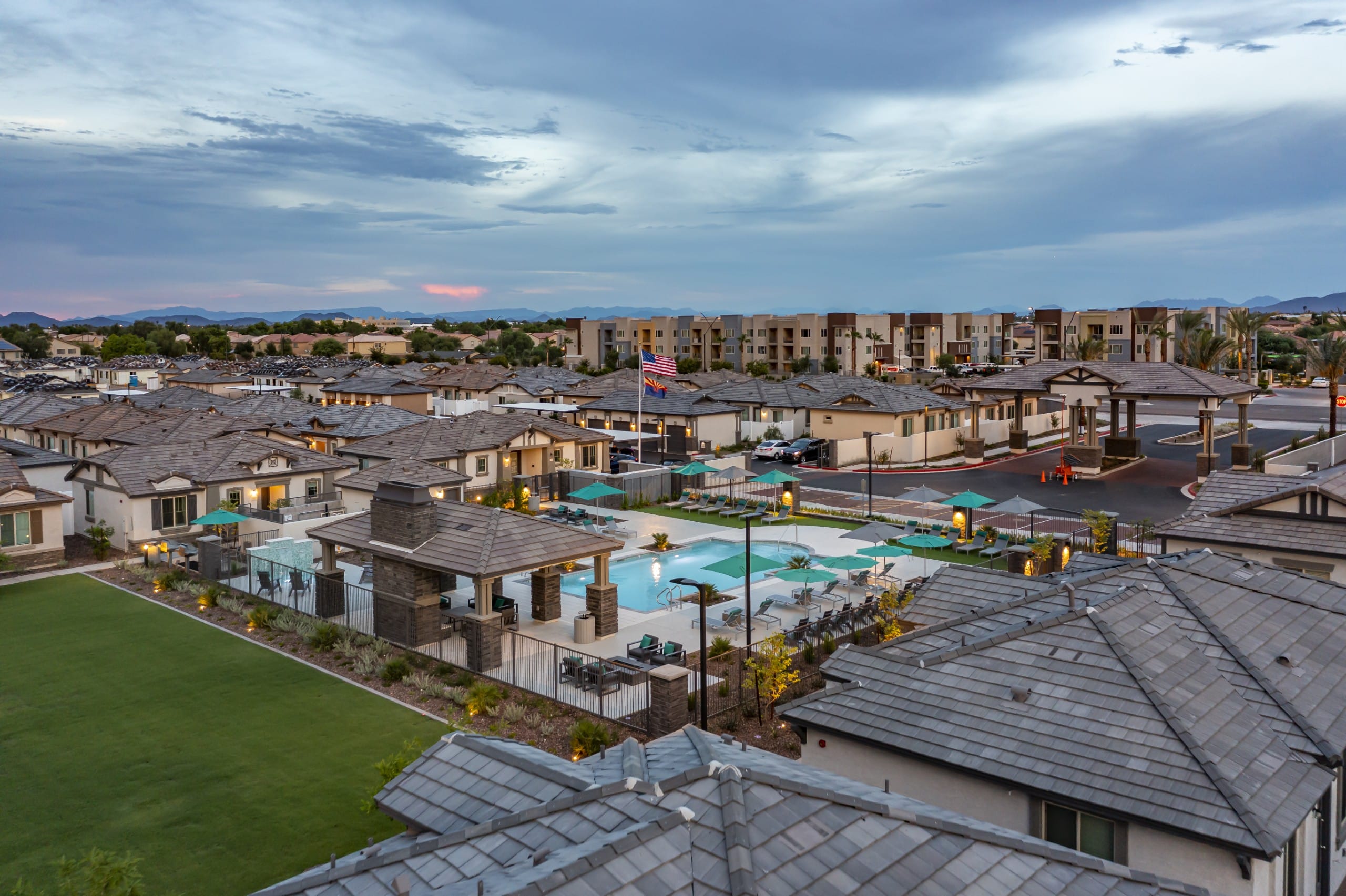 VLux at Peoria Heights offers a dog park, an upscale luxury pool and spa with a social lounge, fireplace, outdoor firepit area, a 24-hour fitness center, pickleball court, and a barbecue area.